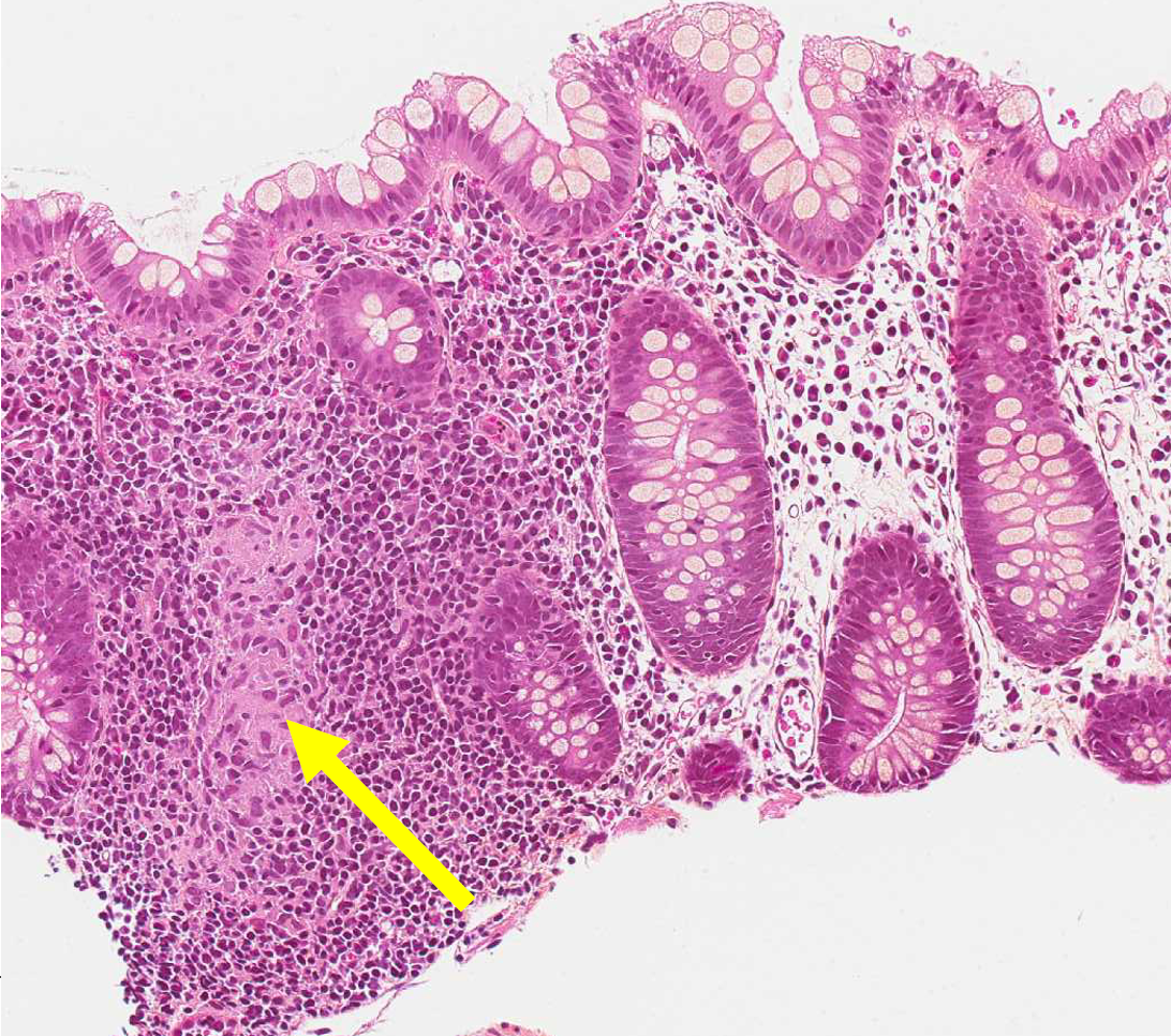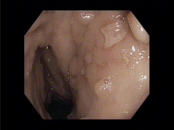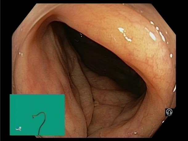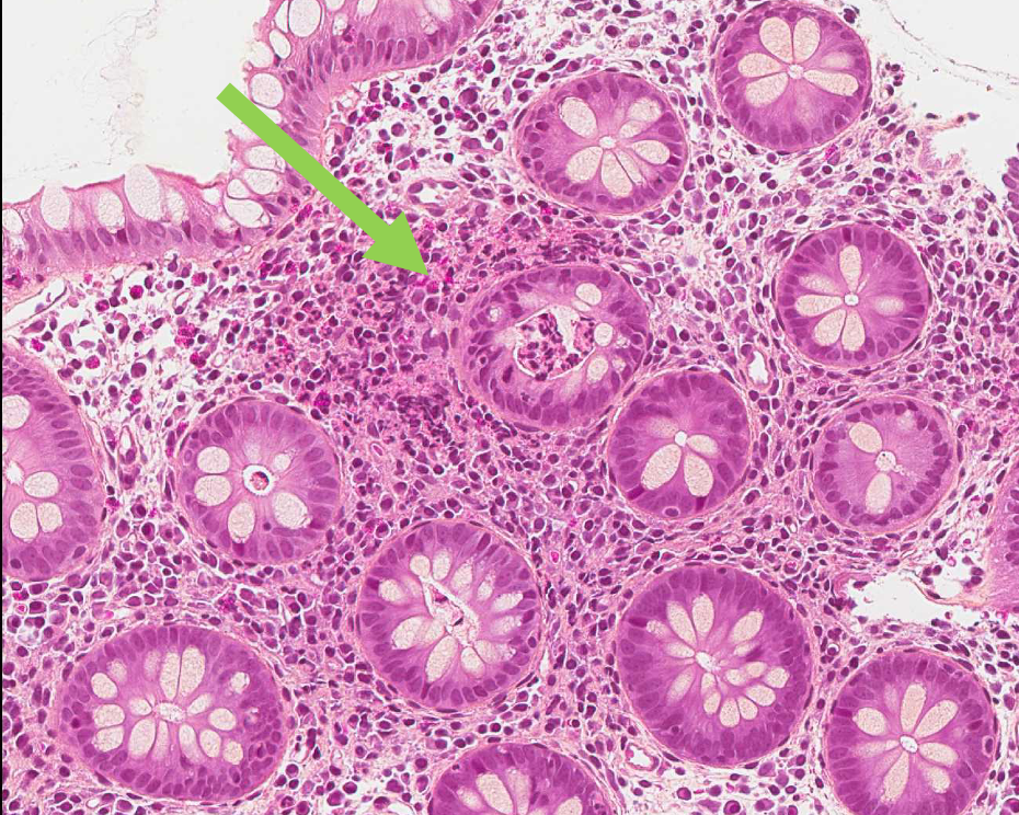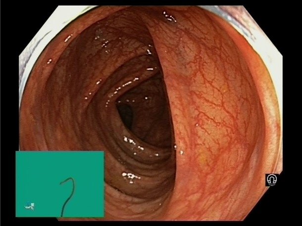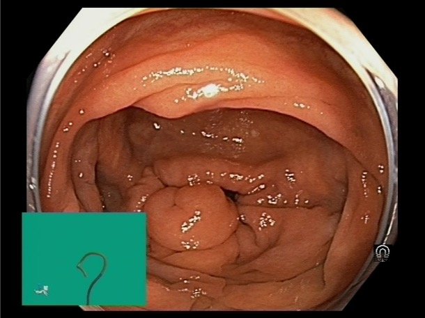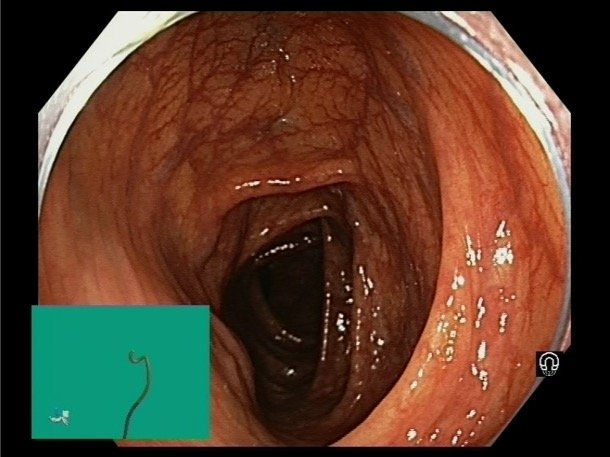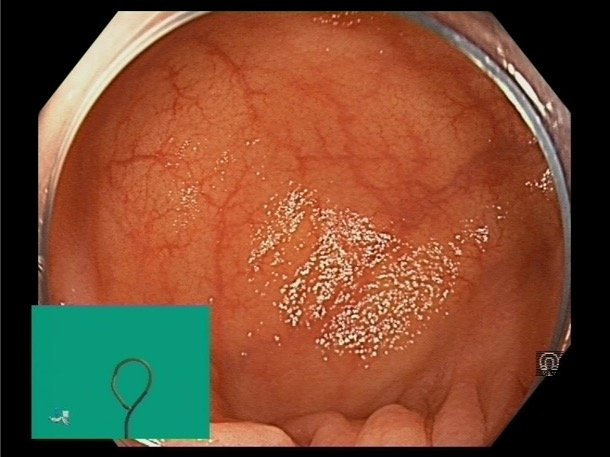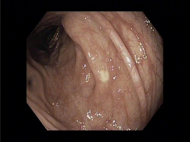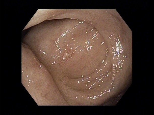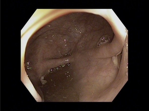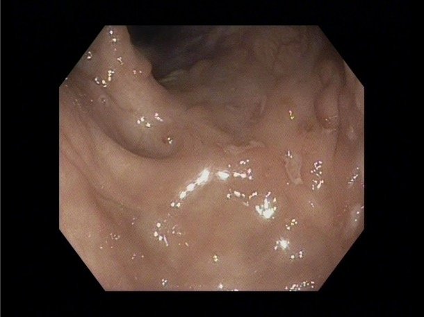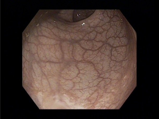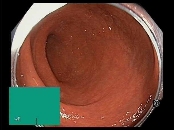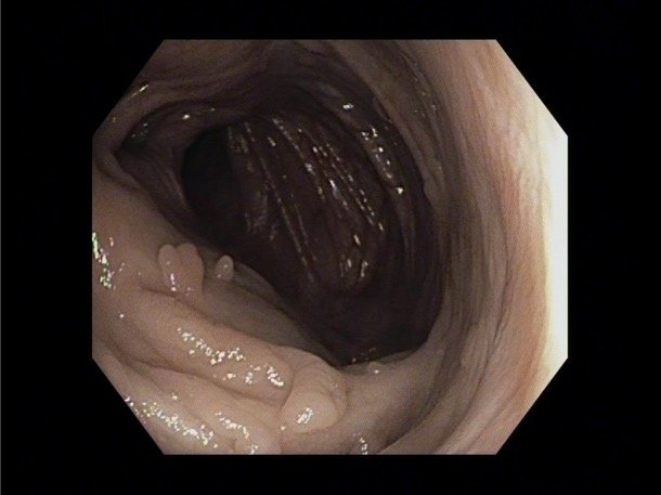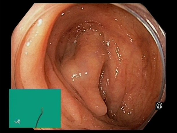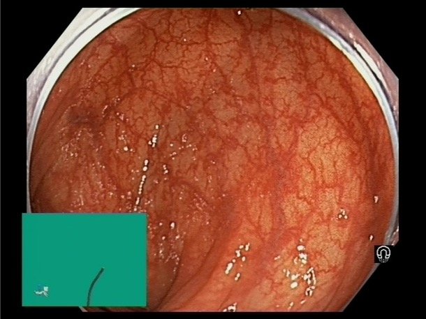 Kolon med fibrinbelagte erosjoner og pseudopolypper. Rektum uten patologi.