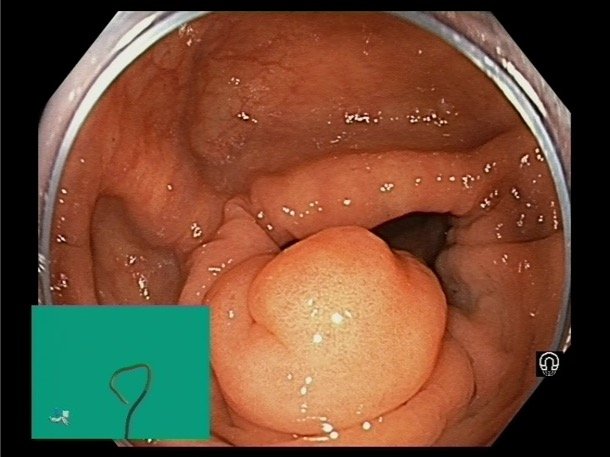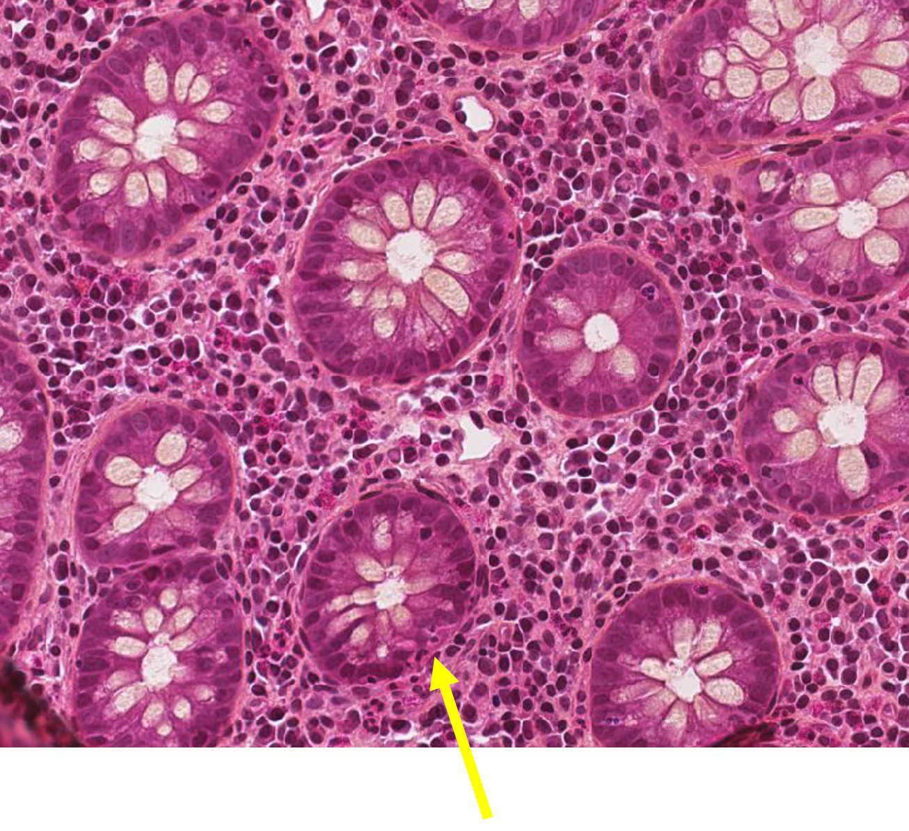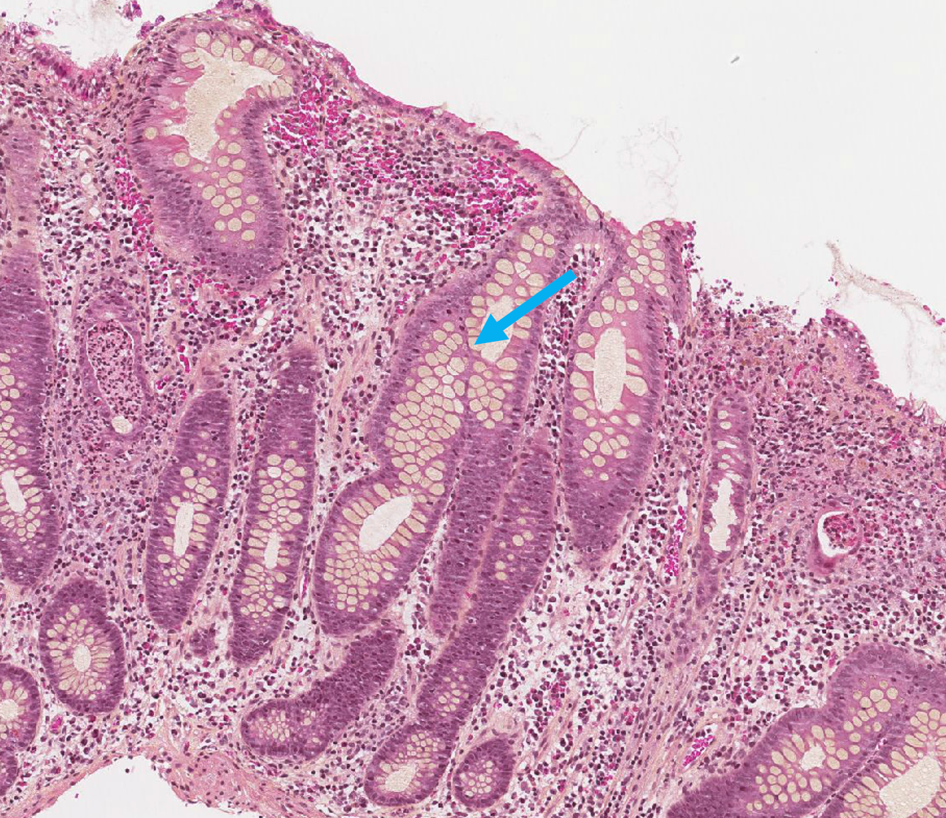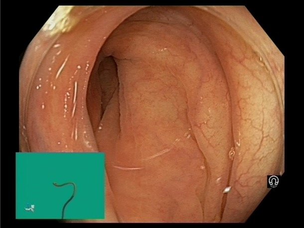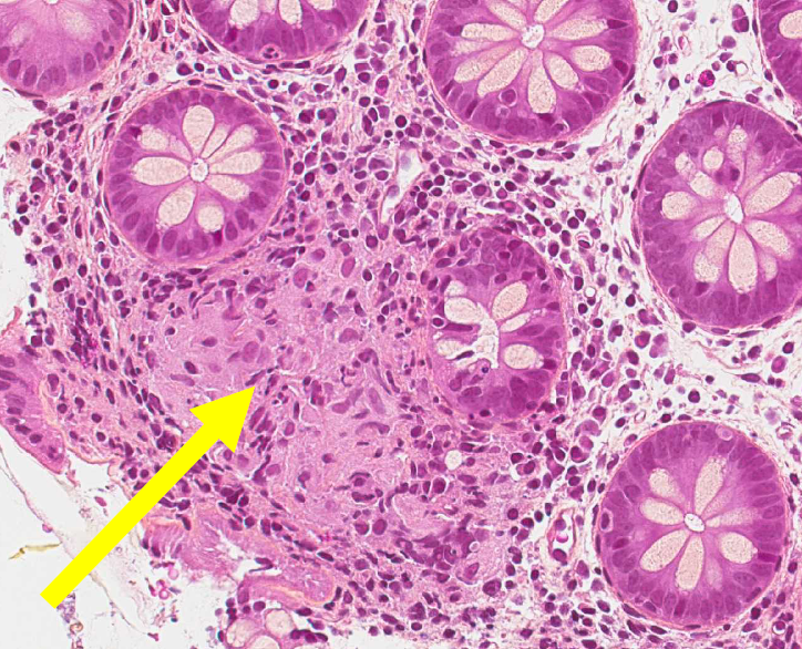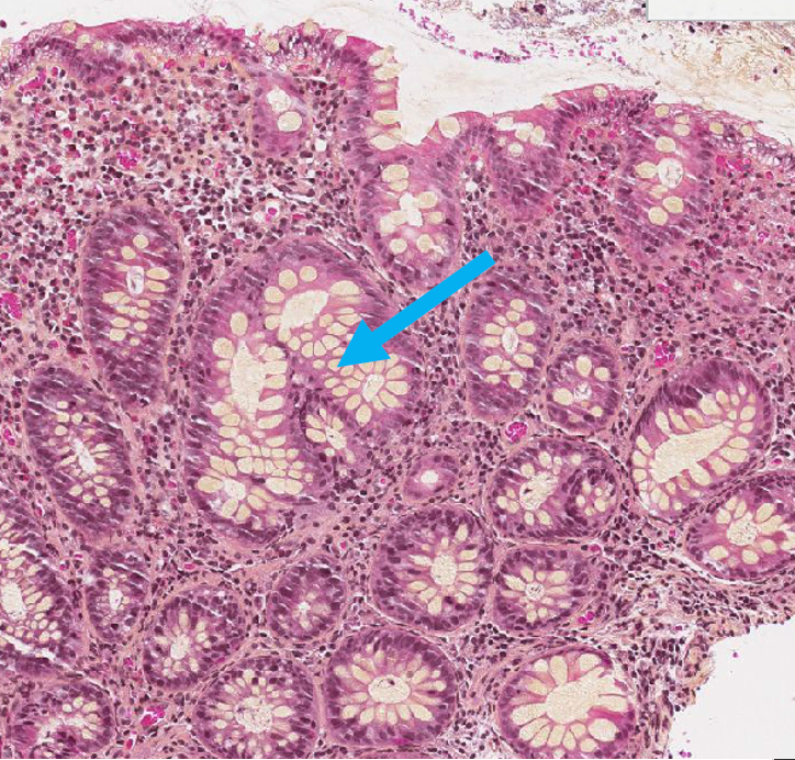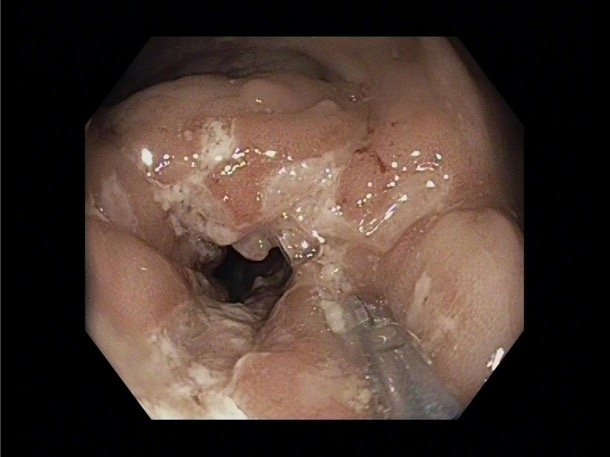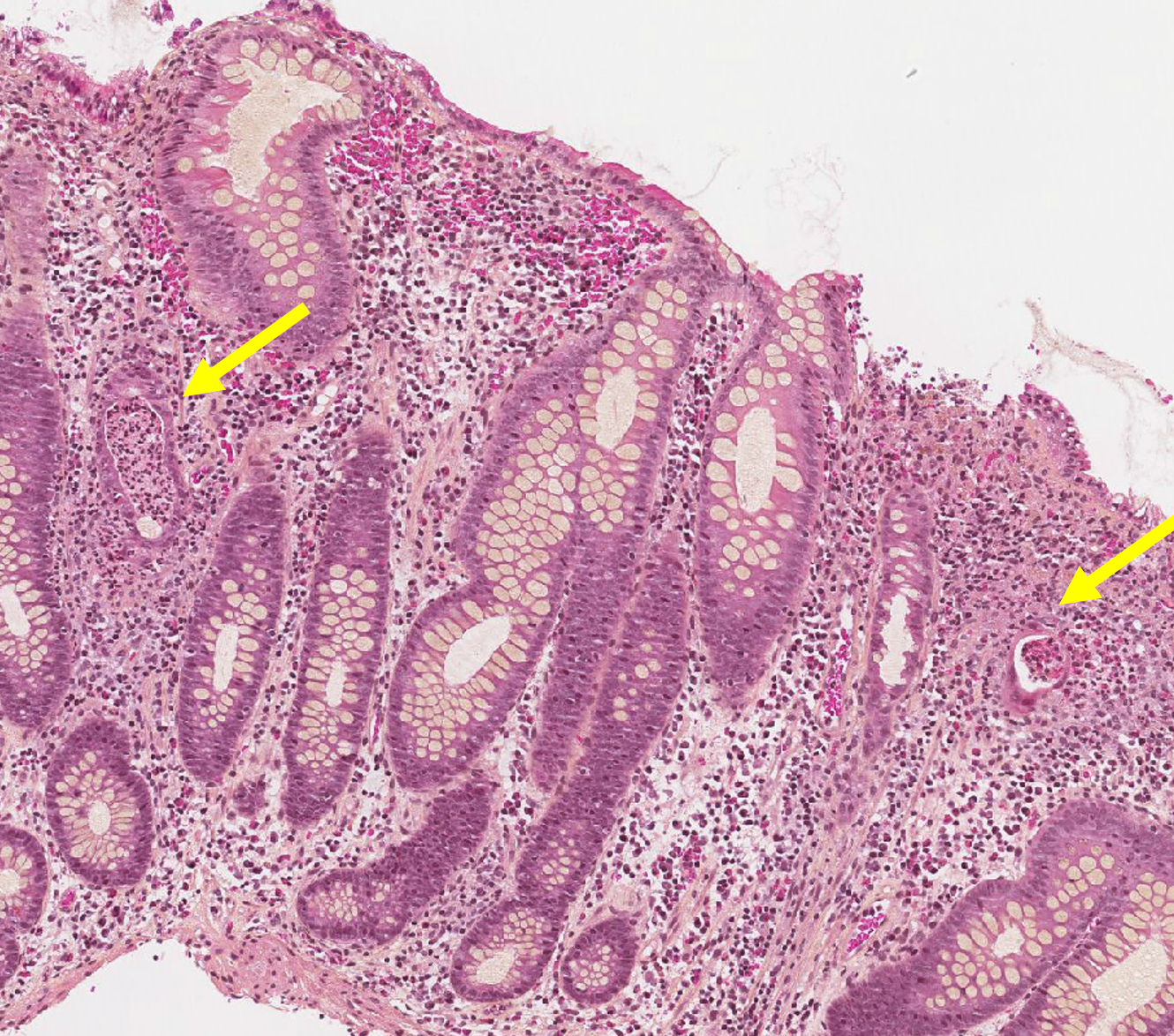 Kolon med fibrinbelagte erosjoner og pseudopolypper. Rektum uten patologi.